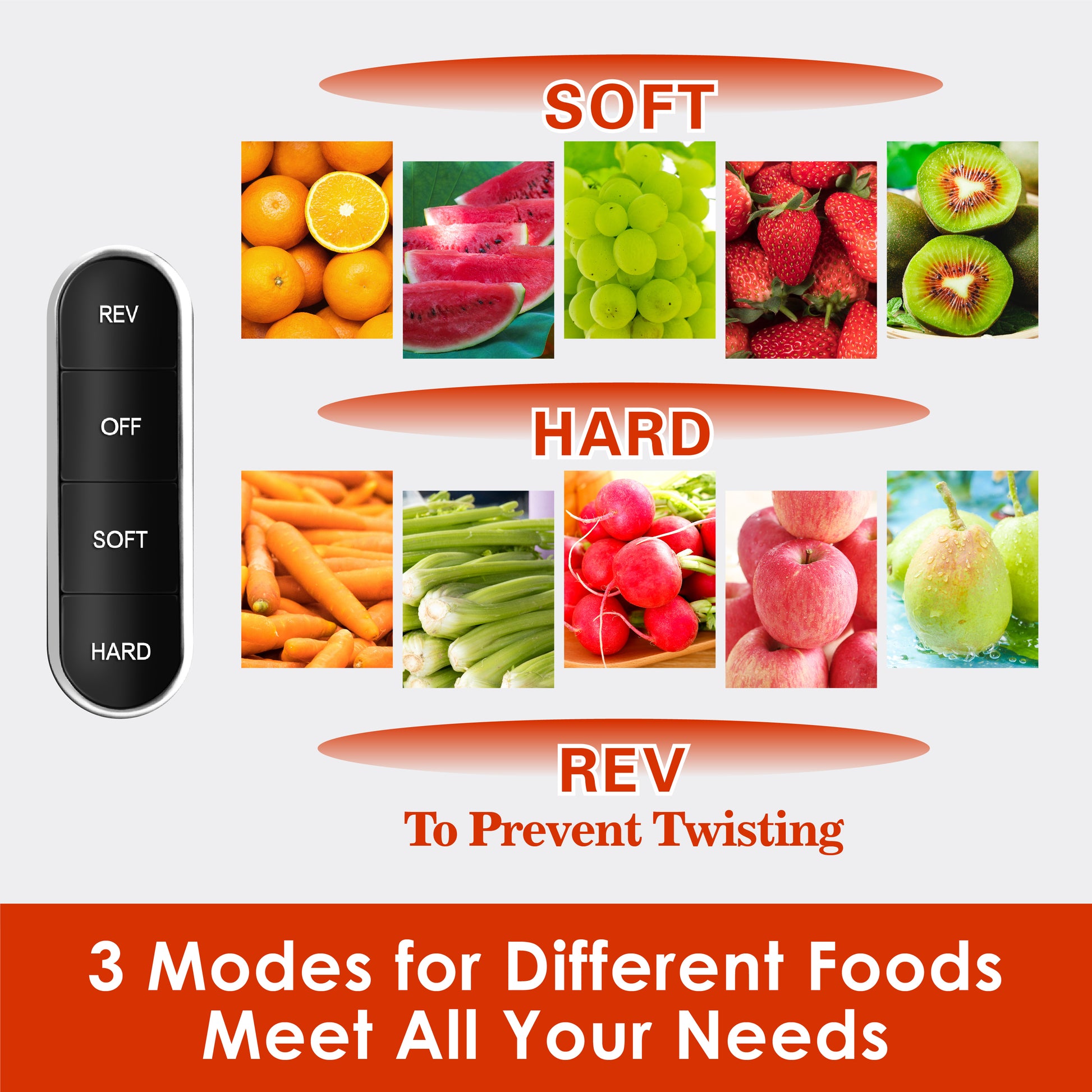 - 2 Modes & Reverse Function: This slow juicer is equipped with 2 speed modes and reverse function. You are able to adjust the soft/hard mode according to different vegetables and fruits, which could better extract high-purity juice and reduce oxidation rate.