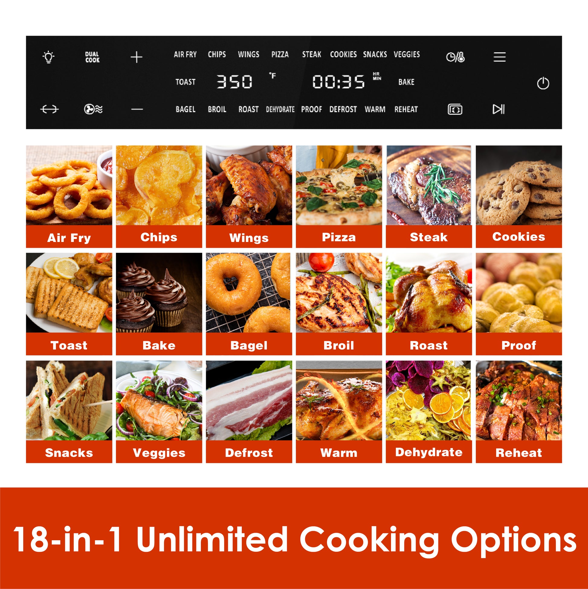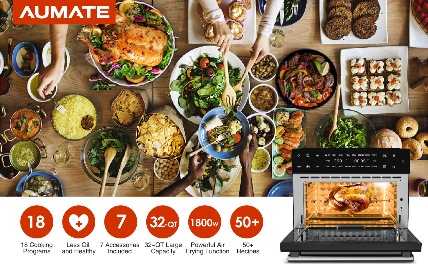 - 18 Preset Functions & Advanced Dual Function: AUMATE Kitchencote air fryer toaster oven combo can fulfill air fry, bake, roast, broil, toast, dehydrate, rotisserie, defrost, warm, proof, and so on, one machines can meet all your cooking needs, great space saver. Meanwhile the innovative dual cook function enables you to combine any two functions in preset. Make Complex recipes effortless and rich the dish's flavor.