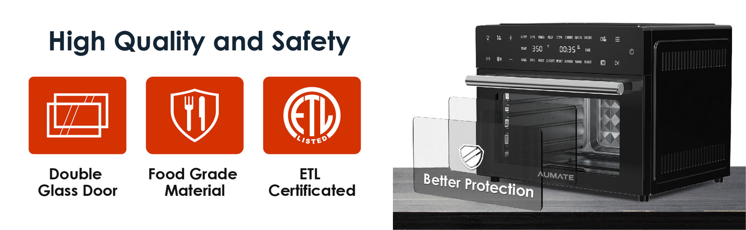 - Powerful, Fast and Save Time: AUMATE Kitchencore toaster ovens countertop with 6 heat elements, 1800 watt in total, meanwhile double glass door heat reduces heat loss effectively, this will reduce cooking time greatly.