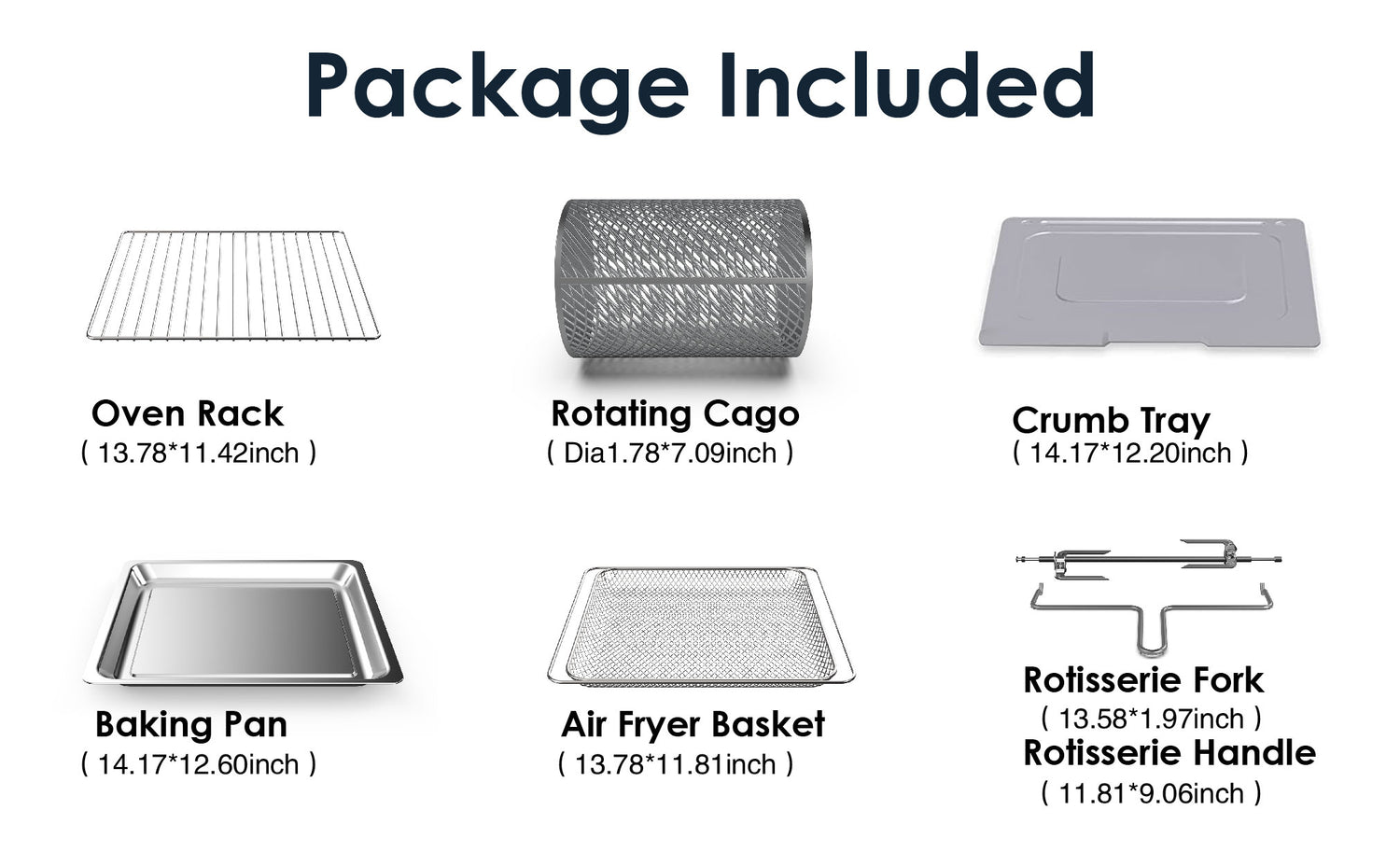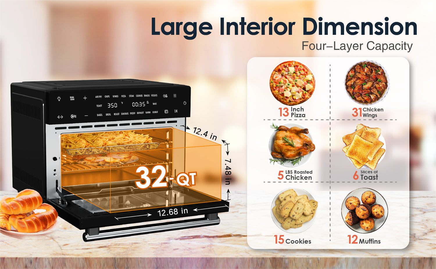 - 32QT Extra-Large Capacity and 6 Accessories: This convection toaster oven has a large interior capacity, which fits 13-inch pizza, 9 slice toast, 6lbs rotisserie chicken and whole turkey, 6 accessories can meet all your cooking needs. It's perfect for whole family party.