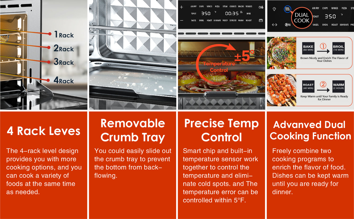 - Precise Temperature Control & Crispy Taste: This convection oven built in smart chips and temp sensors, which work together to control temperature and eliminate cold spots, the temperature error is within 5°F.